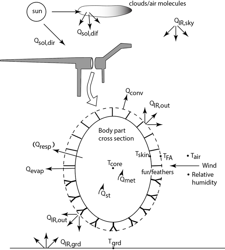 We employed the widely-tested biophysiological modeling software, Niche Mapper™ to investigate the metabolic function of the Late Triassic dinosaurs Plateosaurus and Coelophysis during global greenhouse conditions. We tested a variety of assumptions about resting metabolic rate, each evaluated within six microclimate models that bound paleoenvironmental conditions at 12° N paleolatitude, as determined by sedimentological and isotopic proxies for climate within the Chinle Formation of the southwestern United States. Sensitivity testing of metabolic variables and simulated “metabolic chamber” analyses support elevated “ratite-like” metabolic rates and intermediate “monotreme-like” core temperature ranges in these species of early saurischian dinosaur. Our results suggest small theropods may have needed partial to full epidermal insulation in temperate environments, while fully grown prosauropods would have likely been heat stressed in open, hot environments and should have been restricted to cooler microclimates such as dense forests or higher latitudes and elevations. This is in agreement with the Late Triassic fossil record and may have contributed to the latitudinal gap in the Triassic prosauropod record.